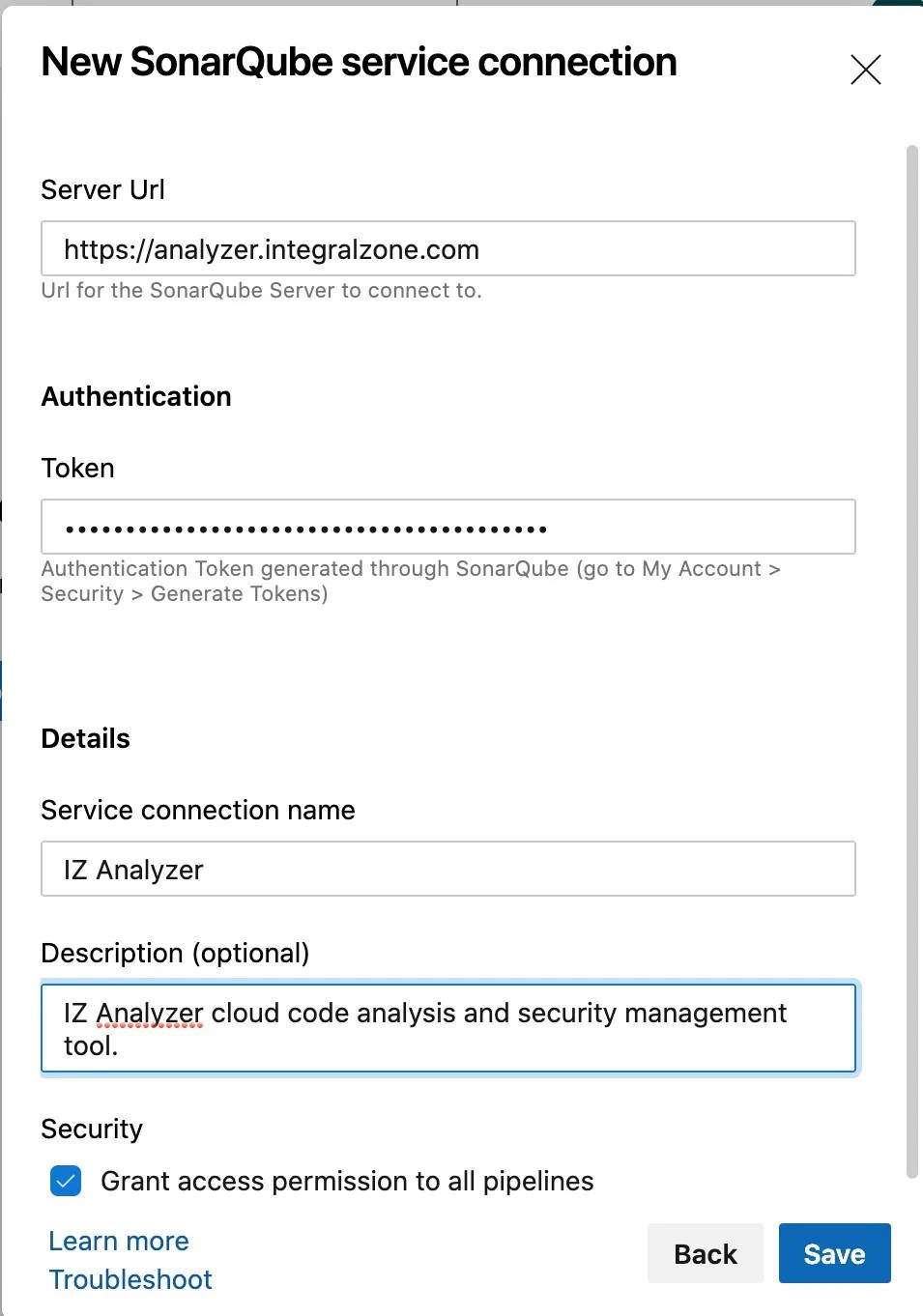 Enter the values for new SonarQube service connection as shown below and click Save.