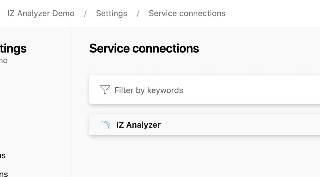 In Azure Dev Ops, go to project settings -> Service connections to create a new service connection to IZ Analyzer.
