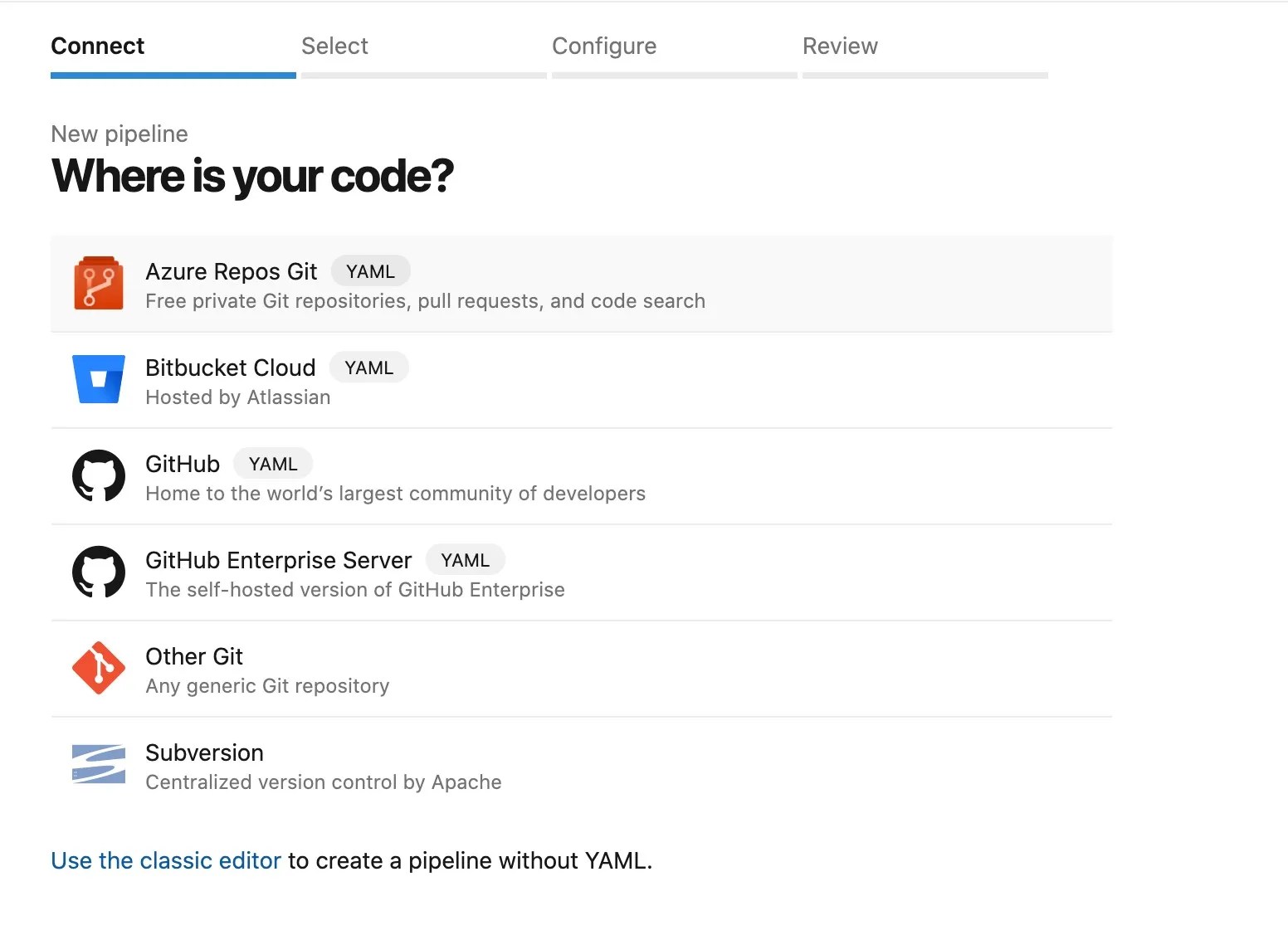 Select where your code is residing. Since it is in the same project, we are going to choose Azure Repos Git. If your code is residing elsewhere, please select the appropriate option and configure it.