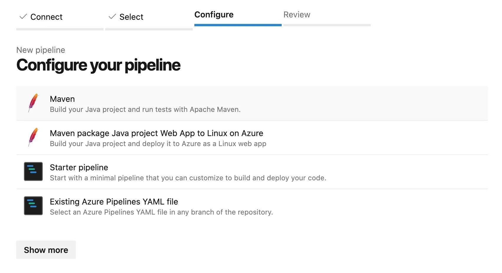 Select the configuration type. You can choose either Maven or the Starter Pipeline. The template is just a placeholder and can be easily edited later.