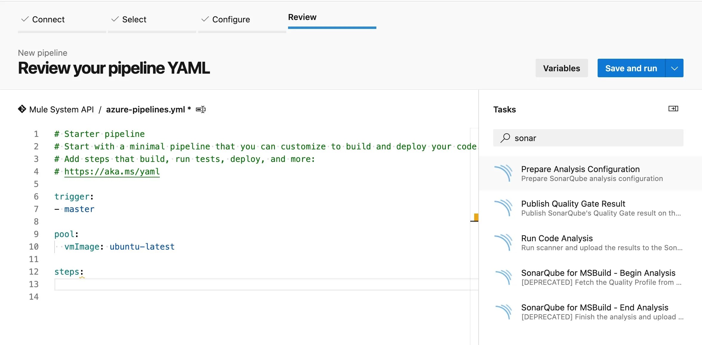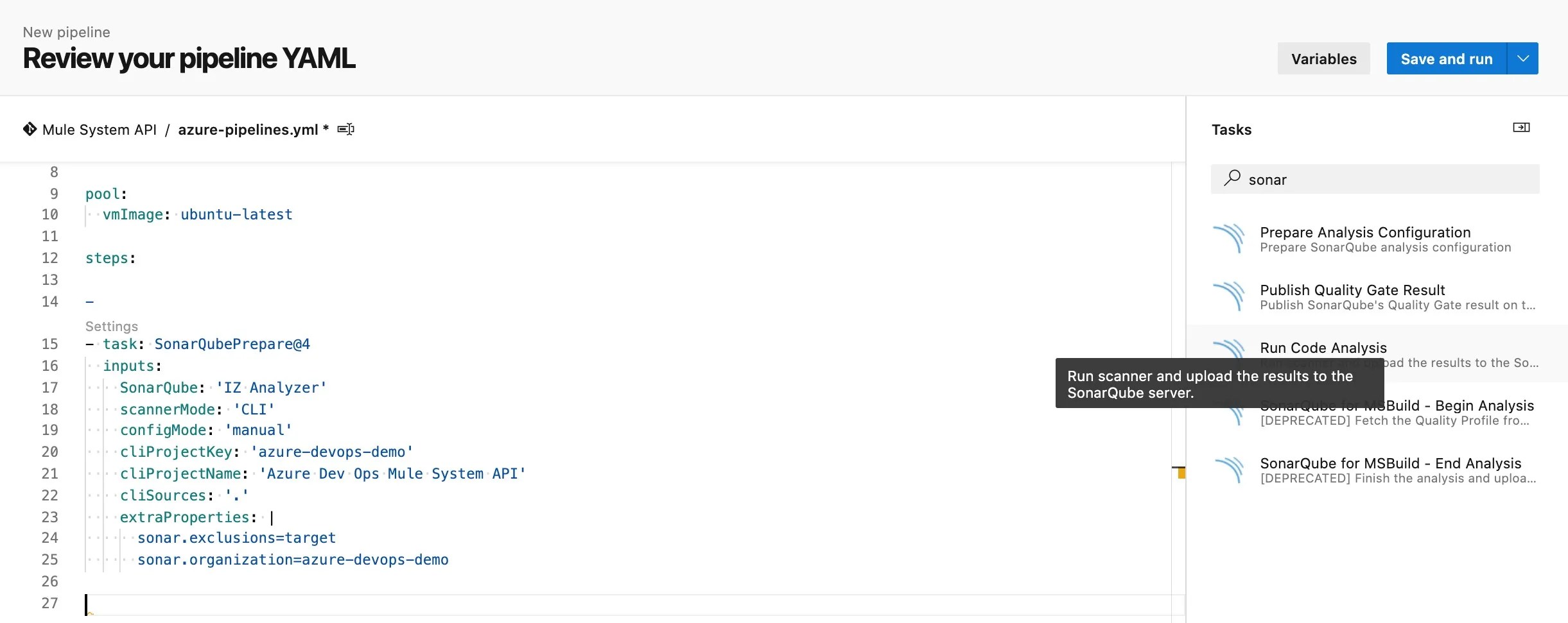 Select the project main language – either Mule or Other from the option list. It should show you the commands to use and the parameters already filled (for example sonar.organization, sonar.exclusions, etc). Use them in Azure Dev Ops pipeline next.